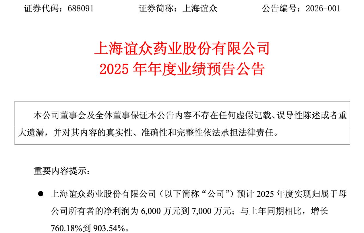 公告指出,经财务部门初步测算,上海谊众预计2025年度实现归属于母公司所有者的净利润为6000万元到7000万元;与上年同期相比,将增加5302万元到6302万元,同比增长760.18%到903.54%。