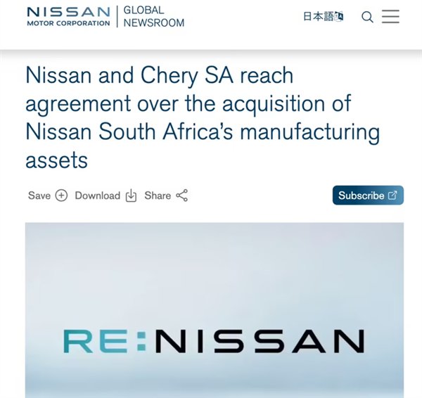 快科技1月25日消息,日产汽车日前宣布,已与奇瑞南非公司就日产位于南非罗斯林的制造资产出售事宜达成一致。