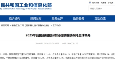 最新数据显示,2025年我国造船完工量5369万载重吨,同比增长11.4%,占全球市场总量的56.1%;新接订单量10782万载重吨,占全球市场总量的69%;截至12月末,手持订单量27442万载重吨,同比增长31.5%,占全球市场总量的66.8%,手持订单量再创历史新高。