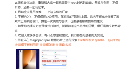 值得一提的是,还有网友询问:“能不能上自定义温控?”席迎军直接透露:“暂时还没有,不过已经在分析看怎么弄,温度上线提升有限,配合磁吸风扇会更好一些。”如能解开温控,搭载第五代骁龙 8 至尊版处理器的 MagicPad 3 Pro 或能释放更强性能。