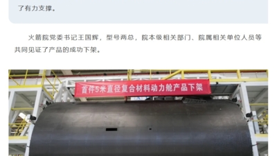 快科技4月12日消息,来自中国航天科技集团一院的消息,4月11日,该院研制的5米直径复合材料动力舱产品正式下架。