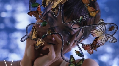 妆容同样为这组大片赋予了强烈的视觉符号。深邃眼妆衬托锐利眼神,冷艳中透出高级质感;而粉色大面积晕染眼周与颊彩,搭配浓郁红唇与黑色蜘蛛饰物,展现出前卫张扬的个性氛围。艺术与时尚在她身上达成完美融合。