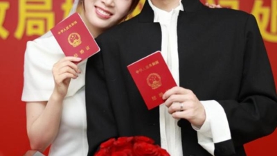 照片中,王昶穿着新中式外套,钱天一穿着修身的旗袍,两人拿着结婚证和玫瑰花,甜笑合影留念。